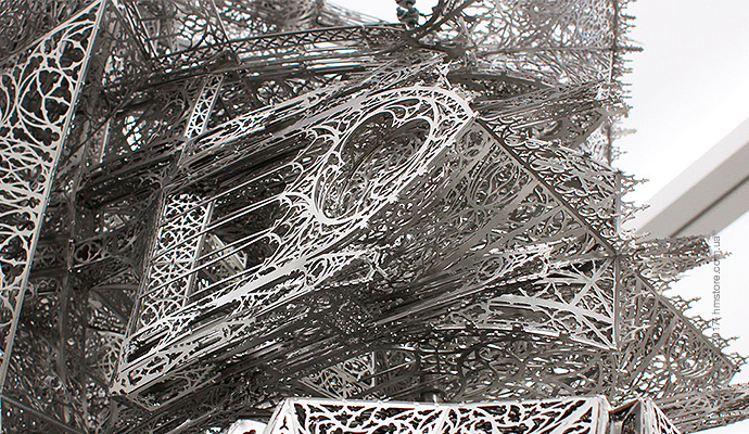 Самой сложной и долгой (а также необъяснимой) работой стала массивная скульптура «Twisted Cement Truck». Ее высота – около 3,5м, и она является частью серии «Gothic Works». Это – грузовик Mercedes, который состоит из готических архитектурных элементов. Он создан из сотен деталей, вырезанных лазером из нержавеющей стали. Над этой скульптурой работала целая команда мастеров, которым для проектирования и создания потребовалось больше года.
