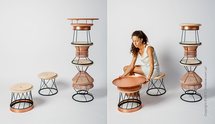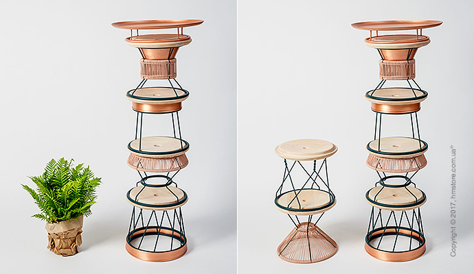 Тотем «Yemenite» состоит из четырех разных табуретов и подноса, которые имеют железный каркас и прутья разного размера. Эти предметы можно складывать друг на друга разными способами в зависимости от интерьера и собственных потребностей. Кроме того, каждый табурет немного отличается от другого. Разобрав этот тотем, вы можете использовать табуреты в качестве приставных столиков, просто добавив сверху поднос. В моменты, когда стулья вам не нужны, вы можете собрать их обратно в тотем и оставить на хранение в любом подходящем месте.