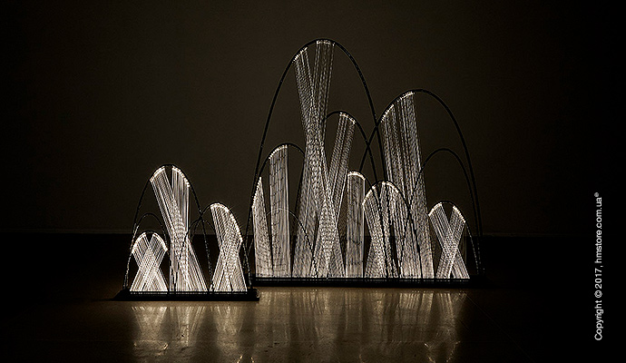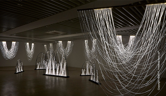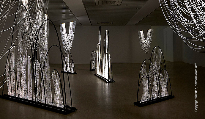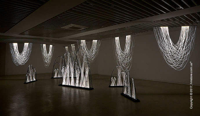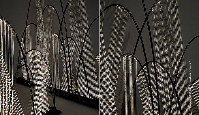 «Parabola Paradiso» – это экспериментальная коллекция осветительных приборов, в которой сочетаются необычные материалы и сам процесс создания захватывающих, скульптурных предметов. Сплетенные вручную нити из углеволокна были утяжелены и подвешены так, чтобы создавать параболические и прямые линейные формы, после чего их положение фиксировалось. Напольные предметы имеют дугообразную структуру с равномерно натянутыми линиями. Подвесные версии с прямой структурой отличаются лучами, которые изгибаются в воздухе. В результате получилась элегантное взаимодействие между гравитацией и светом, которое меняется в зависимости от угла обзора.
