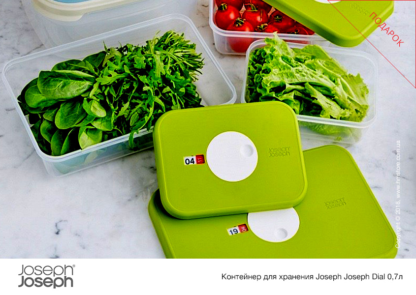 контейнер для хранения продуктов Joseph Joseph Dial. Высокосортный термоустойчивый пластик сохранит свежесть еды и создаст благоприятные условия для правильного хранения. Крышка сочного салатного цвета добавит красочных оттенков кухонному инвентарю и станет сподручным средством для транспортировки продуктов. Как и любой аксессуар с именем Joseph Joseph, контейнер линейки Dial наделен полезным функционалом – на плотно прилегающей крышке расположен циферблат, который поможет обозначить сроки хранения содержимого. Просто поверните ручку против часовой стрелки, чтобы установить день и по – фиксируя месяц. Таким образом можно транспортировать любимые блюда, ограничив себя четким контролем свежести. Контейнер Dial пригоден для хранения продуктов в морозильной камере и разогрева в микроволновке.