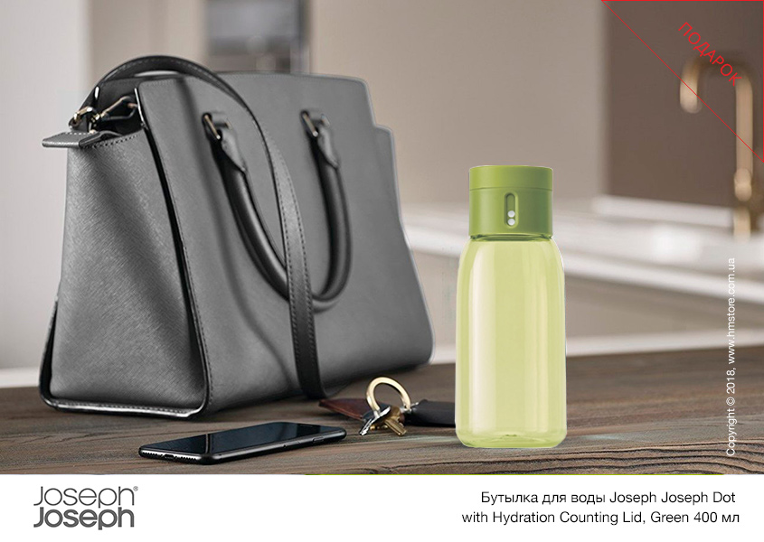 бутылку Joseph Joseph Dot with Hydration Counting Lid. Она изготовлена из экологически чистого тритана – пластика, не включающего в свой состав вредных веществ BPA, пригодного даже для маленьких детей. Бутылка для воды оборудована счетчиком, который работает при повороте крышки. Каждый выпитый полный объем бутылочки (400 мл) вы отмечаете проворотом механизма, и на табло крышки выводится одна секция, по которой можно контролировать количество жидкости и регулировать дневную норму. Широкая горловина бутылки подойдет для наполнения льдом и легкой очистки.