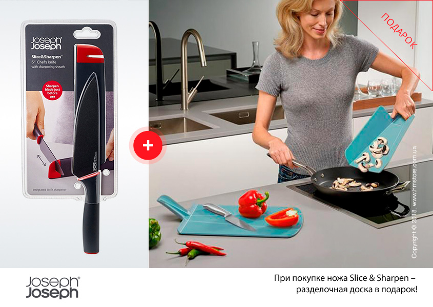Любите остроту ощущений? Вы, конечно, точно знаете, в чем нуждается ваш дорогой сердцу человек, и желания могут быть пикантными… Для особенных прихотей, мы включили в возможный виш-лист....Нож! Большой универсальный шеф-нож сантоку Joseph Joseph Slice & Sharpen 5 с чехлом, да еще и со встроенной точилкой. Он вполне может стать ценным подарком. Красной лентой для него послужит компактная складная разделочная доска Joseph Joseph Chop2Pot Plus, которую мы презентуем в подарок к ножу сантоку.