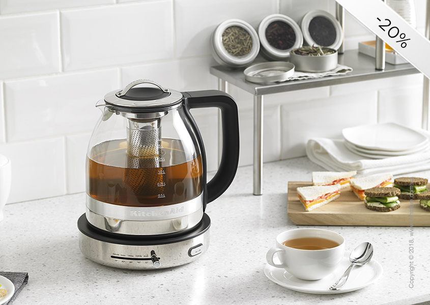 KitchenAid Artisan Glass Tea Kettle – это чайник для настоящих ценителей чая. В нем есть 5 режимов для заваривания разных видов травяного напитка. Съемное сито позволяет сразу же приготовить чай без лишних манипуляций. В итоге вы сможете разлить по чашкам готовый напиток прямо из чайника. Также прибор может пребывать в теплом режиме на протяжении 30 минут, поэтому напиток будет Вас ждать таким же теплым и ароматным.