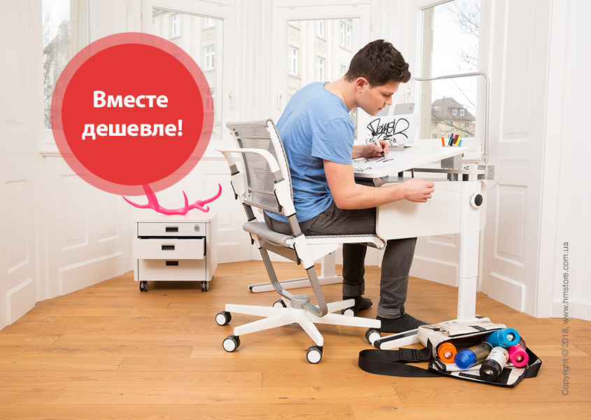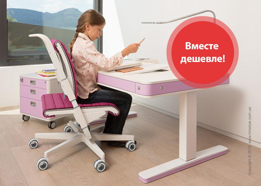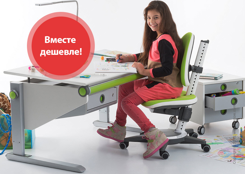Комплект парта moll Champion + кресло moll Scooter 15 – это мебель для будущих победителей. Парта Champion подойдет для творческих детей. Помимо регулировки высоты, часть столешницы можно наклонять, а часть оставлять в горизонтальном положении. Таким образом ребенок может с комфортом писать или рисовать на подвижной части и ставить инструменты на фиксированную часть столешницы. Мягкое и комфортное кресло Scooter 15 регулируется по высоте и глубине сиденья, а также по высоте спинки. Ребенок на нем может может вращаться вокруг оси и перемещаться по полу. Такой комплект обеспечит максимальный комфорт во время занятий за компьютером или во время чтения или письма.