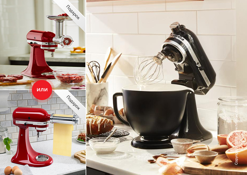 А при покупке миксеров из линейки 5KSM175 и 5KSM7580, Вы получите в подарок: насадку-мясорубка или набор роликовых ножей для приготовления пасты.