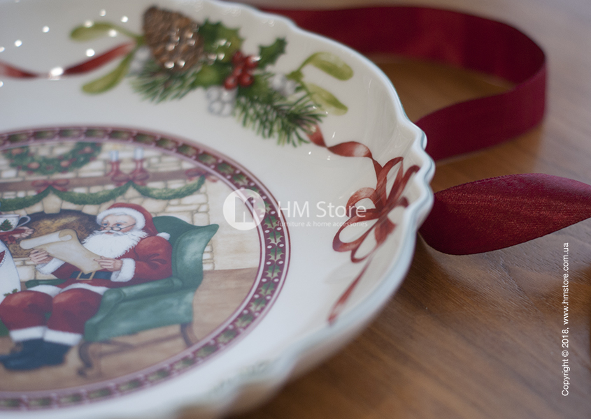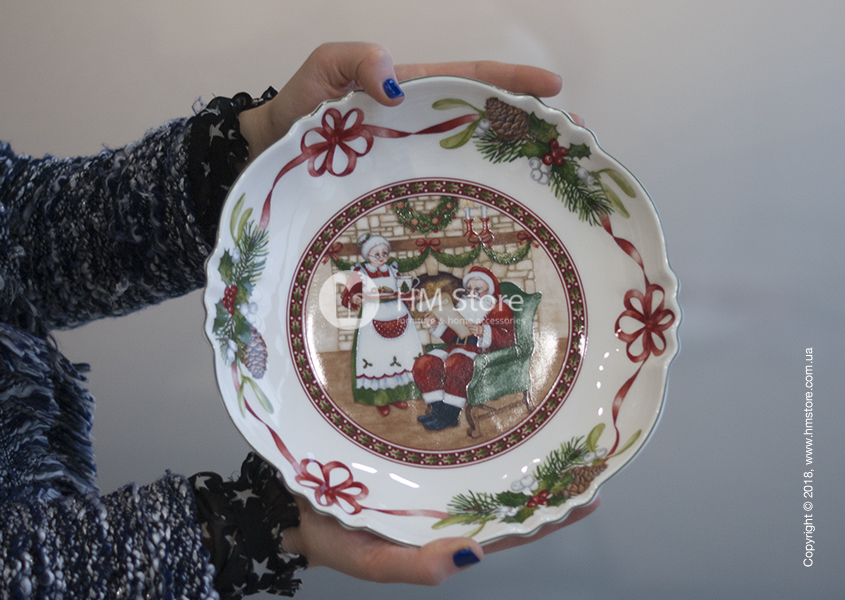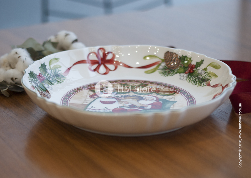 Глубокое круглое блюдо имеет диаметр 24 см, приподнятые стенки и емкость 1,24 л. Красочный декор позабавит как взрослого, так и ребенка. На дне изделия изображена целая картина: Санта-Клаус со своей помощницей в гостиной у камина. По бокам тарелка украшена орнаментом из шишек, ели и остролистов.