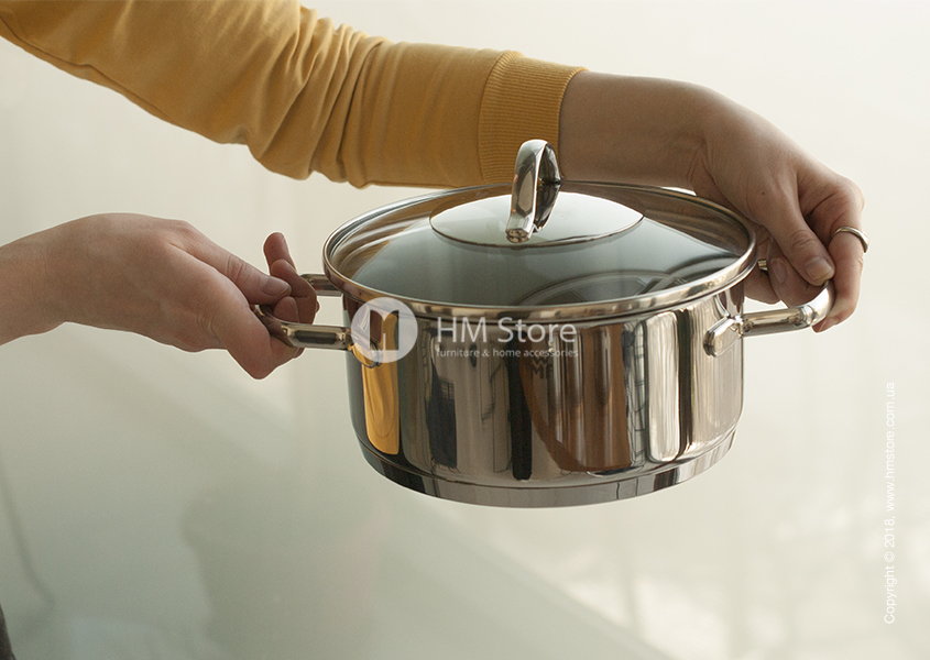 Крышки кастрюль выполнены из стекла и устойчивы к воздействиям температур до 180°C. Ручка, обод крышки и ручки на корпусе выполнены из нержавеющей стали.