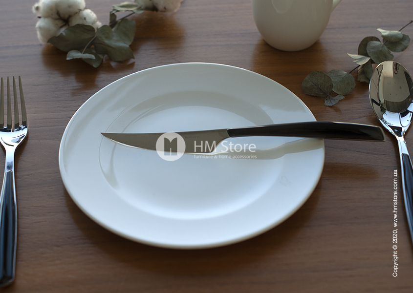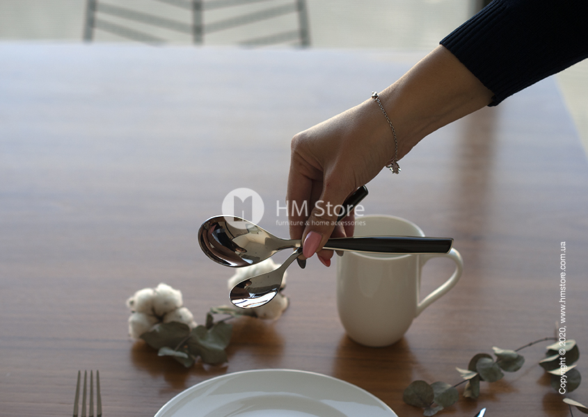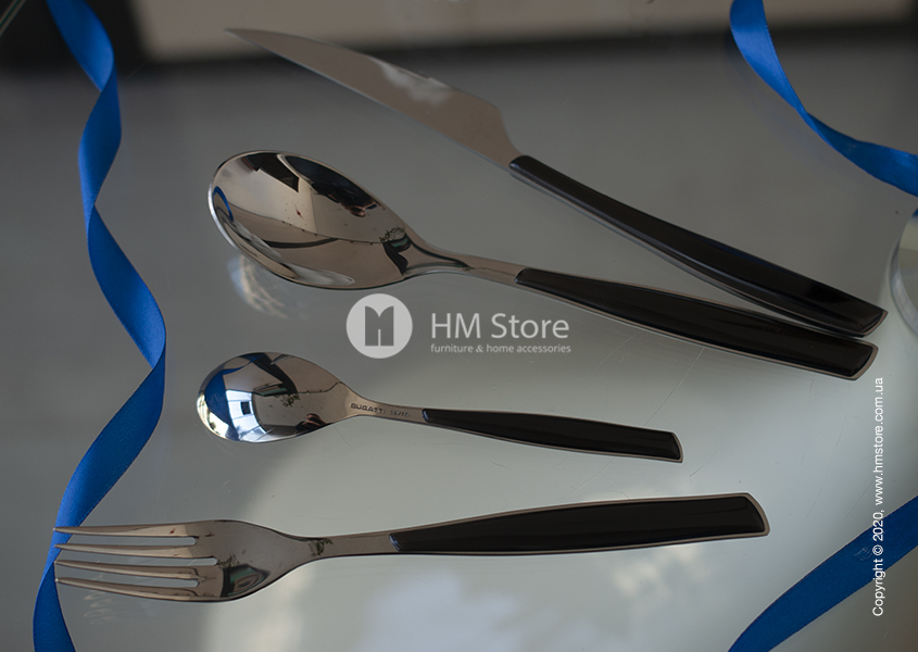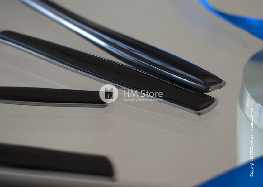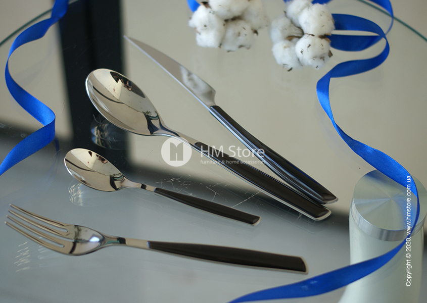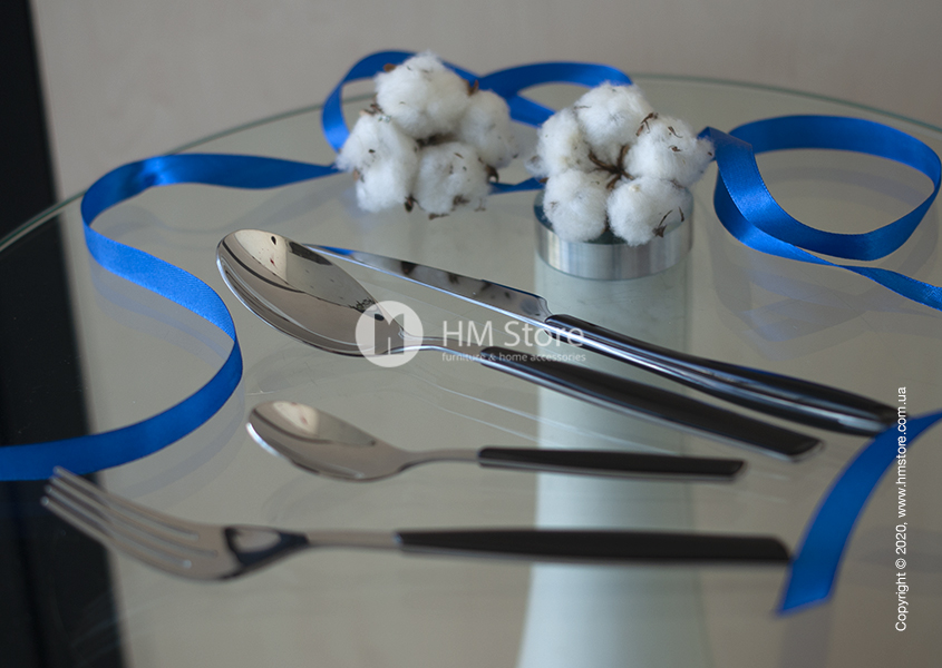 Все изделия выполнены из пищевой нержавеющей стали 18/10, толщина каждого 3мм, а ручки приборов декорированы прочным пластиком в стильном черном цвете, который прекрасно сочетается с любой посудой.