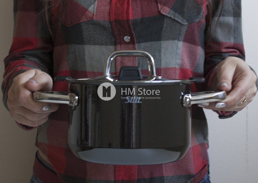 Крышка и ручки выполнены из нержавеющей стали и отполированы до блеска. Они хорошо гармонируют с черной глянцевой эмалью корпуса. Ручки не нагреваются при варке на плите и имеют удобную форму для захвата.
