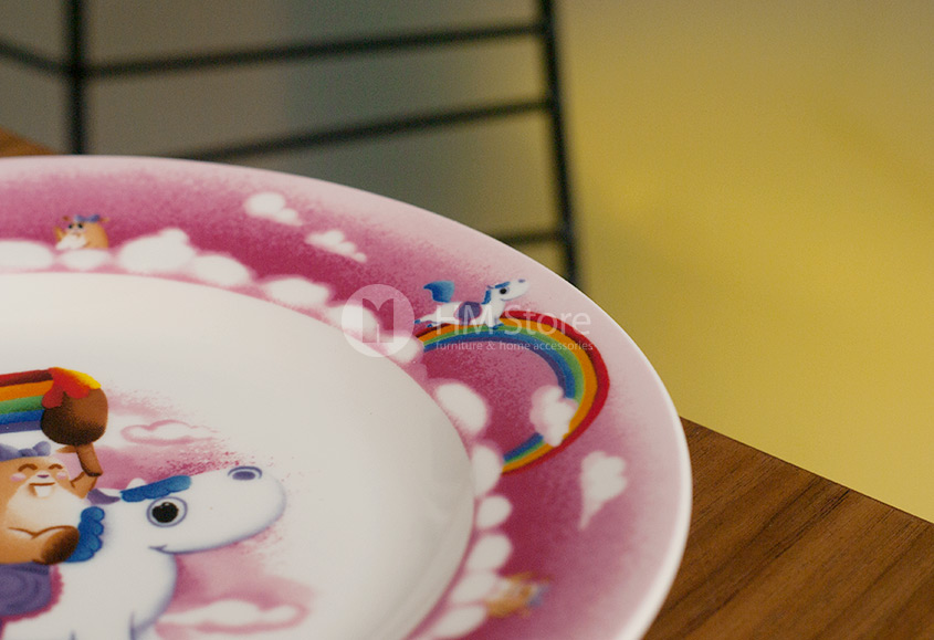 Мелкая тарелка имеет диаметр 22 см, и прекрасно подходит для вторых блюд. Самое интересное в ней – это красочный рисунок. По середине нарисована неизменная героиня коллекции, Лили, на сказочном пони, рисующая радугу на небе. Такой рисунок так и хочется рассматривать, и поэтому будьте уверены, их этой тарелки Ваш ребенок съест всю порцию до конца!