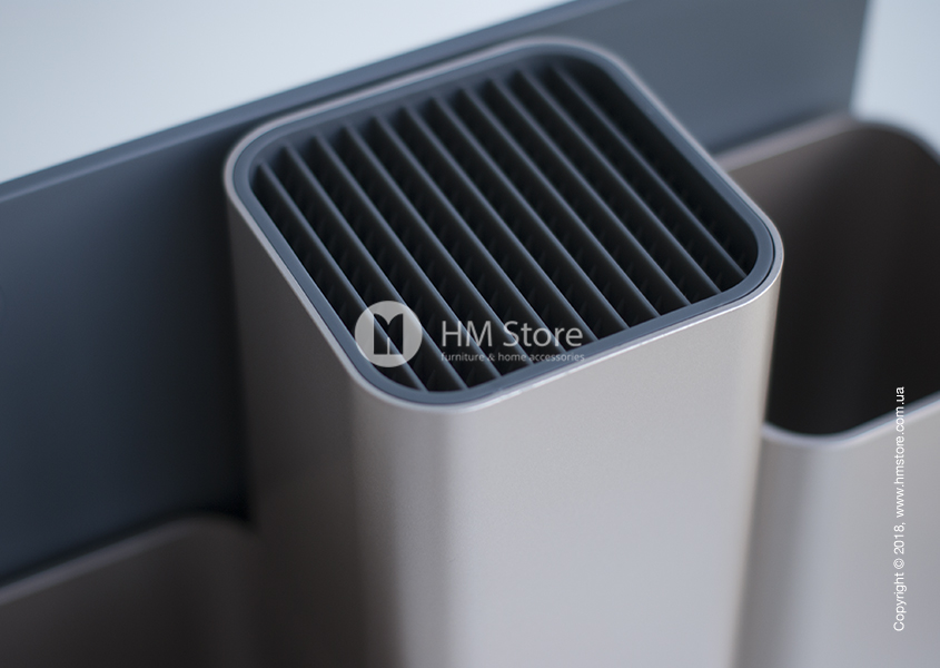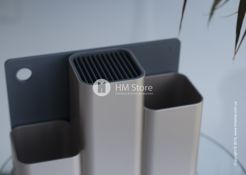 Этот компактный организатор позволяет вам хранить ножи, гаджеты и приспособления в одном удобном месте. Он так же оснащен собственной разделочной доской, которая аккуратно хранится в органайзере сзади. Конструкция имеет отделения для каждого типа инструмента. Включает в себя специальное отсеки для ножей с щелями, которые устойчиво и надежно захватывают лезвия инструментов. Органайзер оборудован также нескользящим основанием, что позволяет устойчиво разместить его на любой кухонной поверхности. Разделочная доска имеет стойкую к повреждениям и удобную для ножа поверхность для резки.
