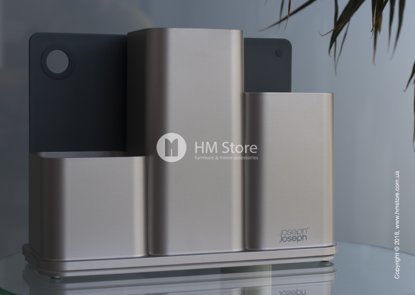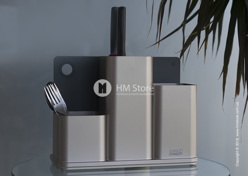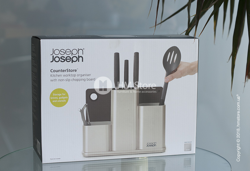Корпус органайзера Joseph Joseph CounterStore выполнен из пластика высокого качества, имеет красивое серебряное покрытие, что станет отличным дополнение кухонного интерьера. Специальная вставка для безопасного хранения ножей изготовлена из силикона, чтобы не повреждать поверхность Ваших инструментов. Разделочная доска также выполнена из пластика и силикона серого цвета. Все это вместе очень гармонично сочетается и дополняет общую картинку.