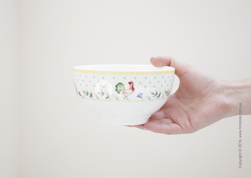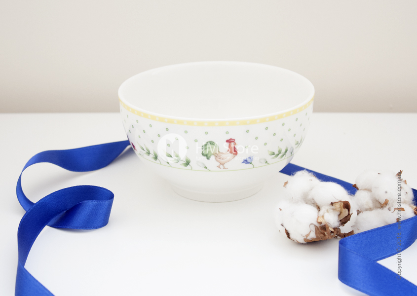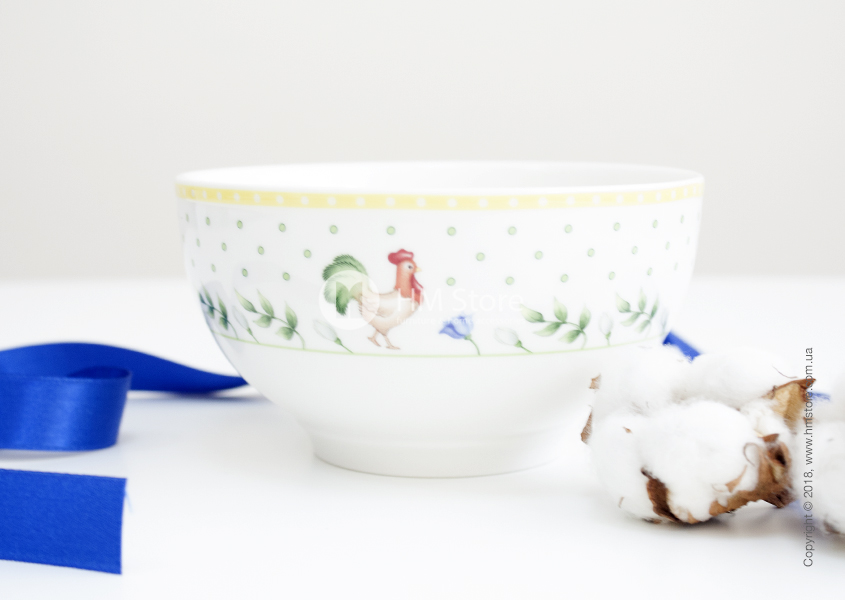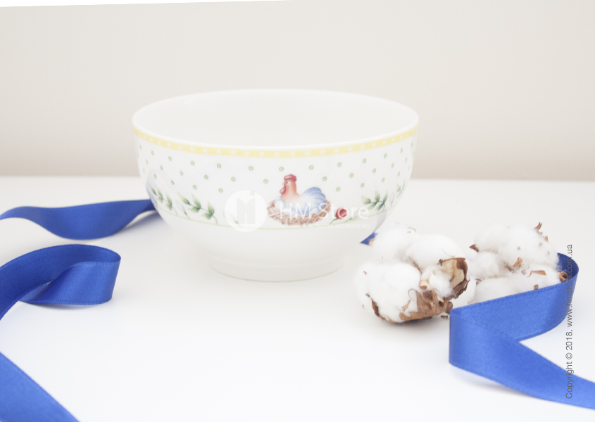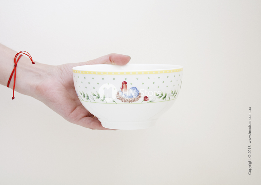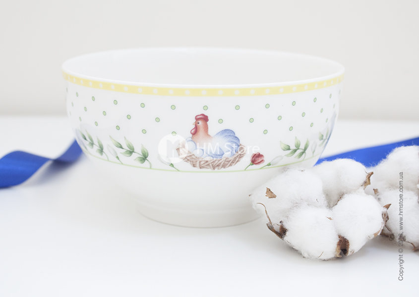 Пиала имеет стандартную круглую форму, сужающуюся к низу. Емкость чаши – 650 мл, что позволяет помещать в неё стандартные порции блюд на одного человека. Стенки изделия украшены пасхальными рисунками в виде курочек на гнезде, разгуливающих петушков и первых цветов. Завершающим штрихом стала желтая кайма по верхнему краю. Изделие произведено из премиум фарфора Villeroy & Boch, которому свойственны такие характеристики, как: