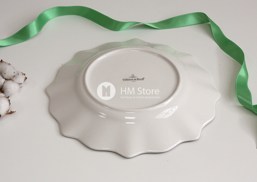 Тарелка произведена из премиального фарфора бренда Villeroy & Boch. Этот материал очень прочный, имеет однородный цвет и гладкую поверхность. Прозрачные слои глазури защищают изделие от царапин и выцветания краски. Ухаживать за такой тарелкой нужно бережно: мыть вручную и не оказывать воздействие высоких температур.