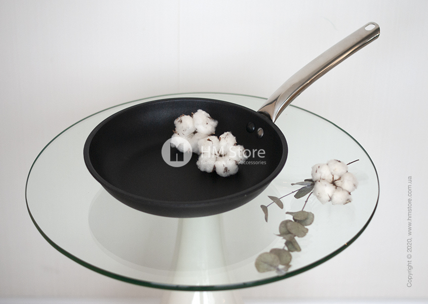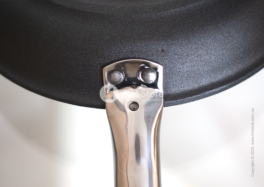 Широкая эргономичная ручка из нержавеющей стали имеет улучшенное, прочное и надежное крепление. К сковороде она крепится на две надежных заклепки.