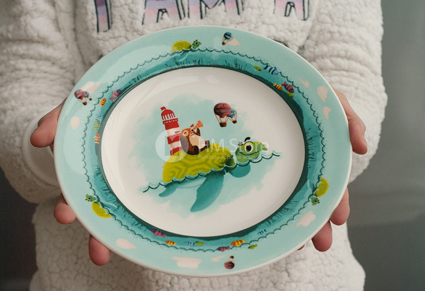 Мелкая тарелка также имеет красочный и интересный декор. На ней изображен тот же хомяк Chewy, плавающий по морю на черепахе, и рассматривающий мир через подзорную трубу. В такой тарелке можно нетривиально подать гарнир или салат Вашему малышу.