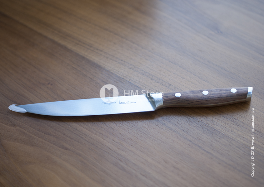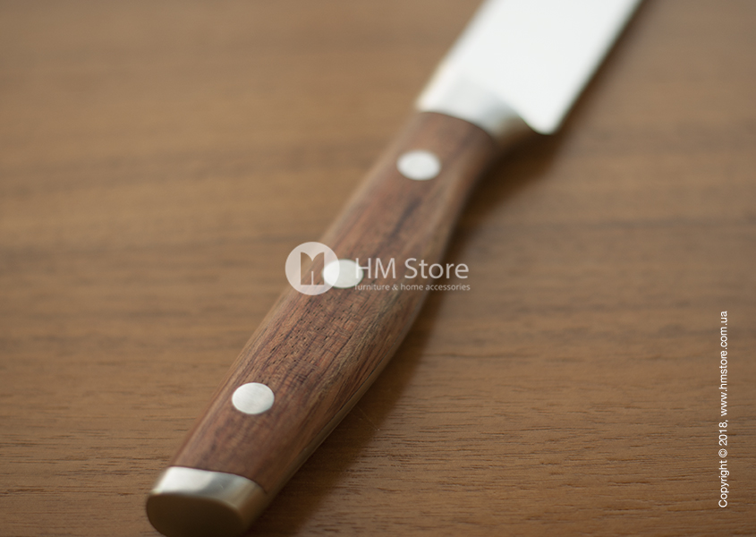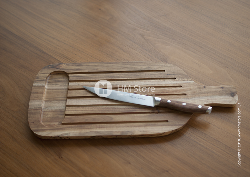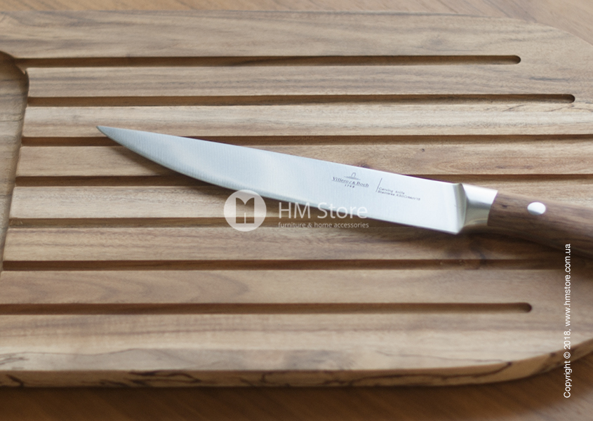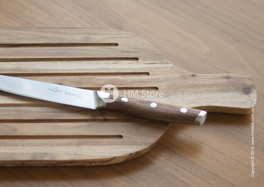 Нож в данном наборе предназначен для нарезки мяса. Он имеет острое лезвие из нержавеющей стали, которое быстро нарезает сырое или приготовленное мясо. Рукоятка ножа выполнена из акации и присоединена к корпусу клепаным способом. Изделие сочетает в себе эргономичность и качество материалов. Нож поставляется в индивидуальной пластиковой коробке. Мыть его нужно вручную, как и доску.