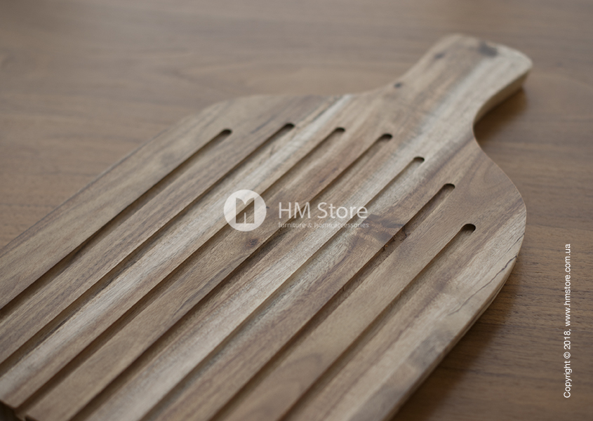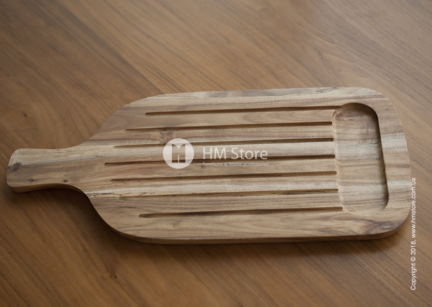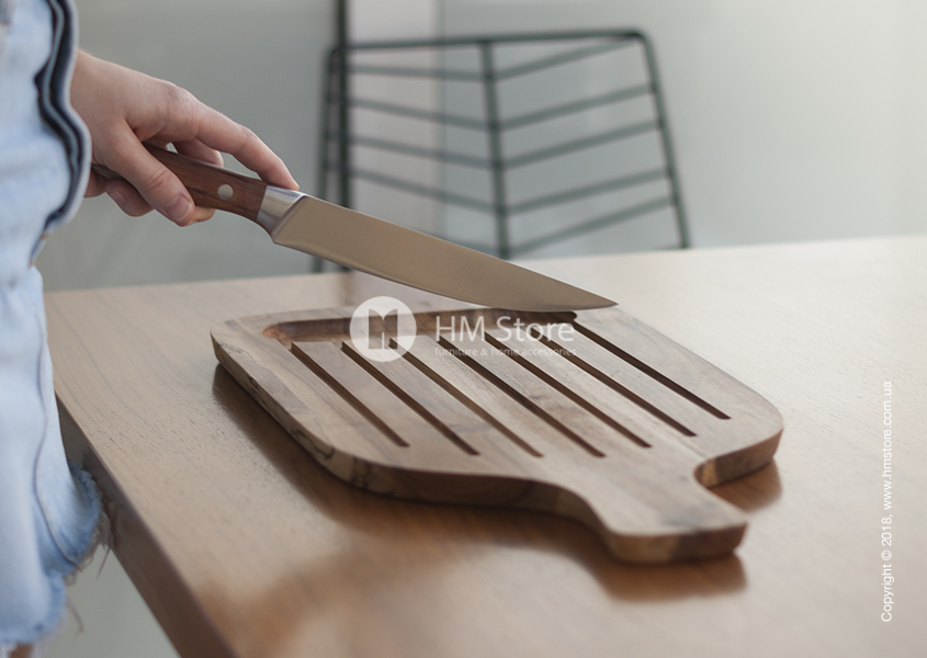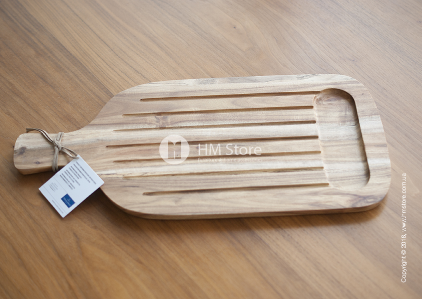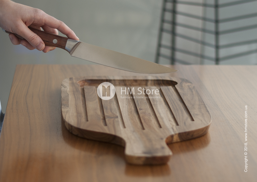 Доска Artesano Original предназначена специально для нарезки мяса, но также подойдет и для других продуктов. Она имеет 7 продольных канавок, через которые стекает сок из мяса или помидоров в специальное углубление. Благодаря такому дизайну Вы не будете лишний раз загрязнять рабочую поверхность кухни. Также предусмотрена ручка для переноски и подачи на стол. Доска изготовлена из древесины акации. Такой материал обладает высокой прочностью и гладкой шлифовкой. Он не портится от горячей воды, а также не впитывает влагу и запахи. Таким образом, на доске можно и нужно подавать мясо, и не бояться, что она испортится от длительного его пребывания. Более того, акация смотрится эстетично и аккуратно, поэтому прекрасно дополнит сервировку праздничного стола. Особенно хорошо доска перекликается с остальной продукцией из коллекции Artesano Original.