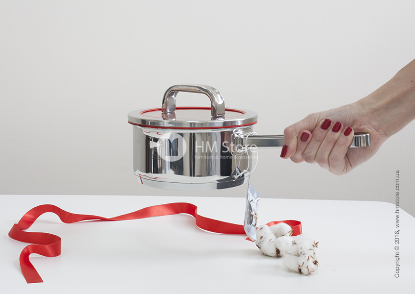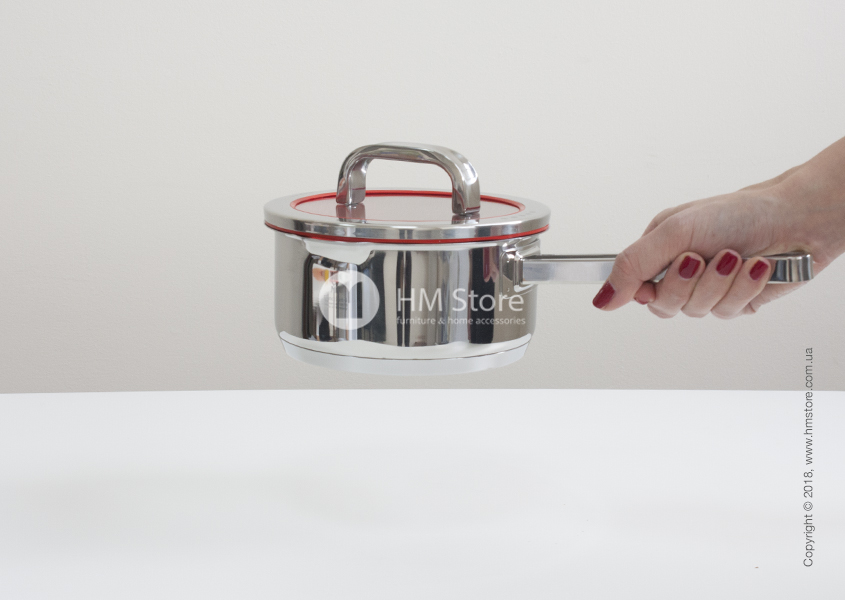 Красный обод выполнен из жаростойкого силикона. Ручка на крышке и ручка сотейника остаются прохладными во время варки. Также имеется внутренняя мерная шкала для облегчения измерения количества жидкости внутри кастрюли. Запатентованная конструкция дна TransTherm способствует оптимальному распределению и сохранению тепла в сотейнике.