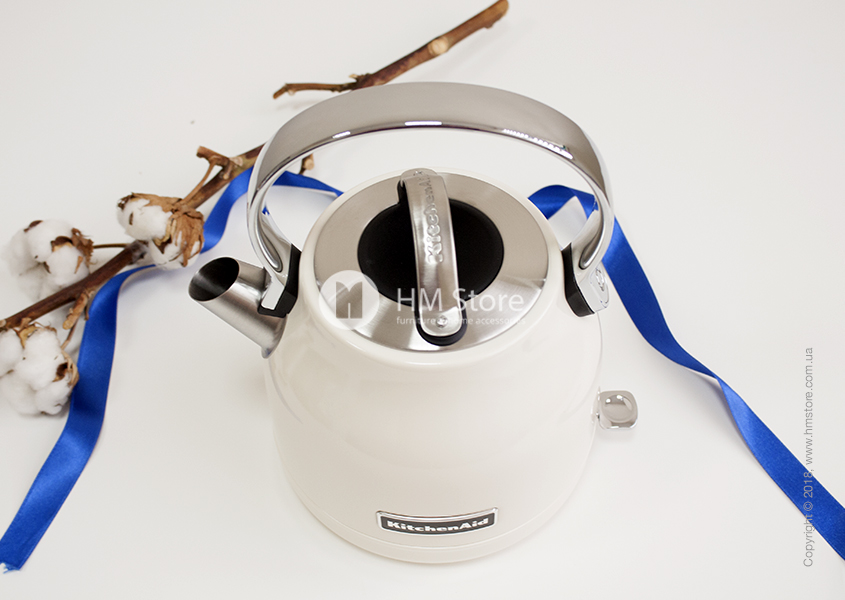 KitchenAid Electric Kettle стоит на подставке, которая позволяет поворачивать прибор на 360 градусов. Также чайник имеет широкую круглую крышку для удобного залива воды и комфортной очистки прибора изнутри. Большая ручка изолирована по бокам пластиком, и поэтому не нагревается и не позволяет обжечься при касании. А для защиты от накипи у основания носика предусмотрена съемная решетка.