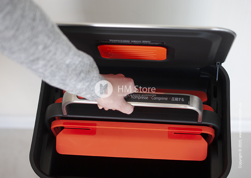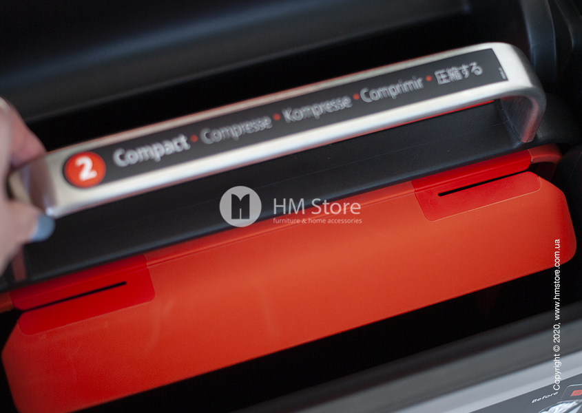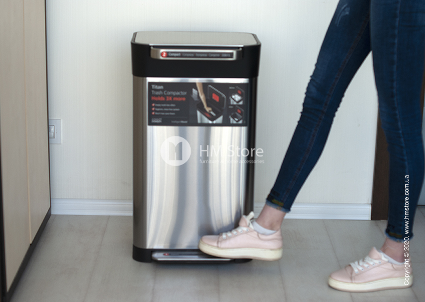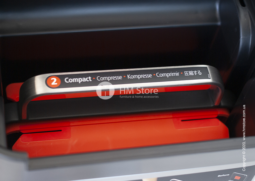 Наличие встроенного механизма для утрамбовки содержимого делает возможным поместить в три раза больше мусора, чем в любой другой контейнер аналогичного размера. С помощью такого компактного способа хранения мусорных отходов Вы сможете сократить расход сменных пакетов и реже будете выносить мусор.
