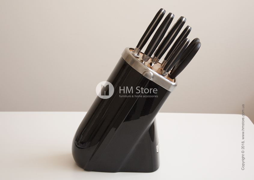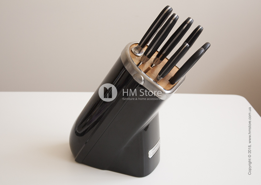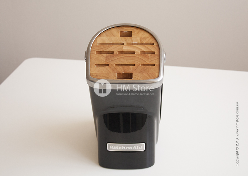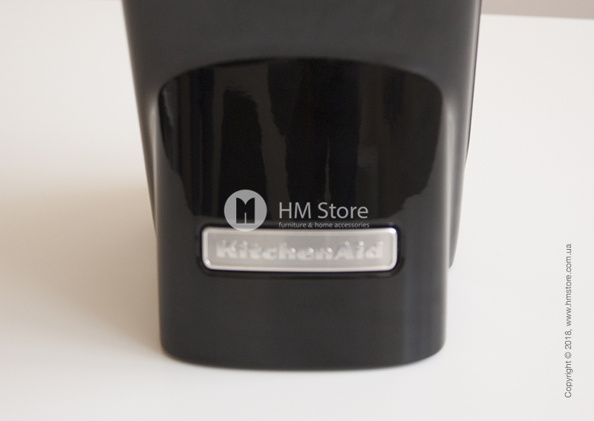 Подставка выполнена из литого алюминия. Черная глянцевая отделка в стиле KitchenAid делает её узнаваемой и позволяет отлично сочетаться с остальными кухонными приборами и инструментами этого бренда. Внутренняя часть с отверстиями выполнена из дерева. Резиновые ножки позволяют ей устойчиво стоять на любой поверхности.