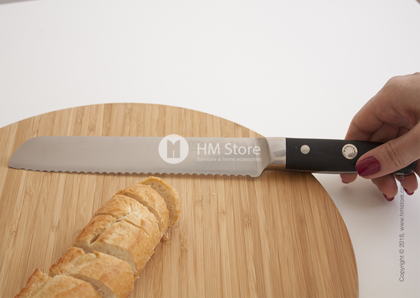 Нож с волнистыми краями отлично подходит для аккуратной нарезки свежего хлеба или хлеба с хрустящей корочкой. Он также отлично подходит для ананасов, дынь или других цитрусовых с твердой кожурой. Длина ножа – 20 см.