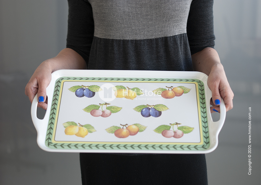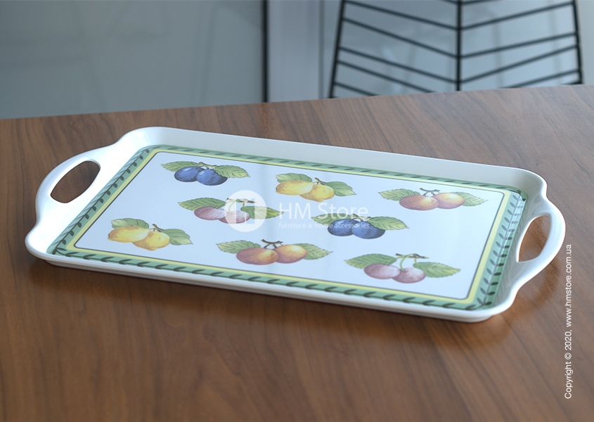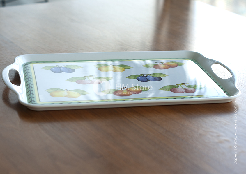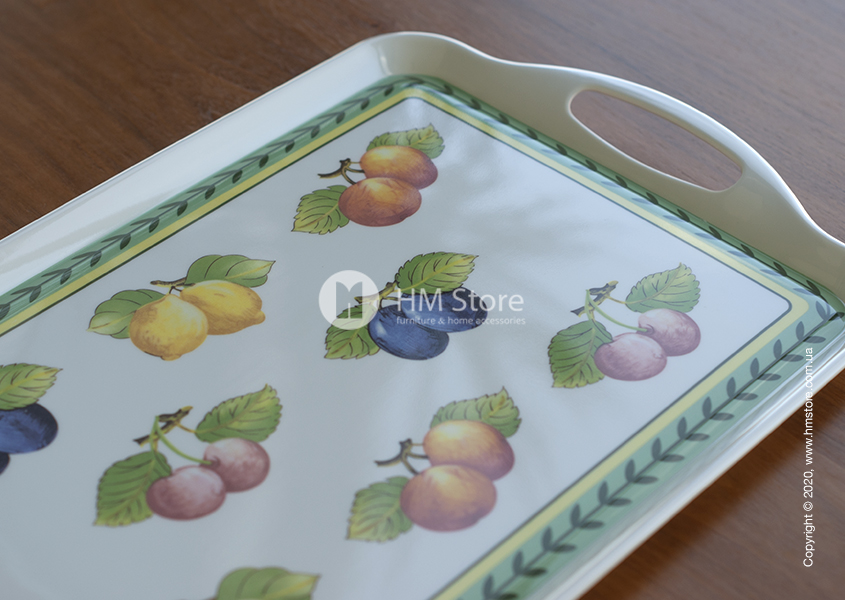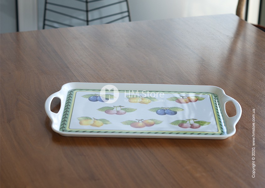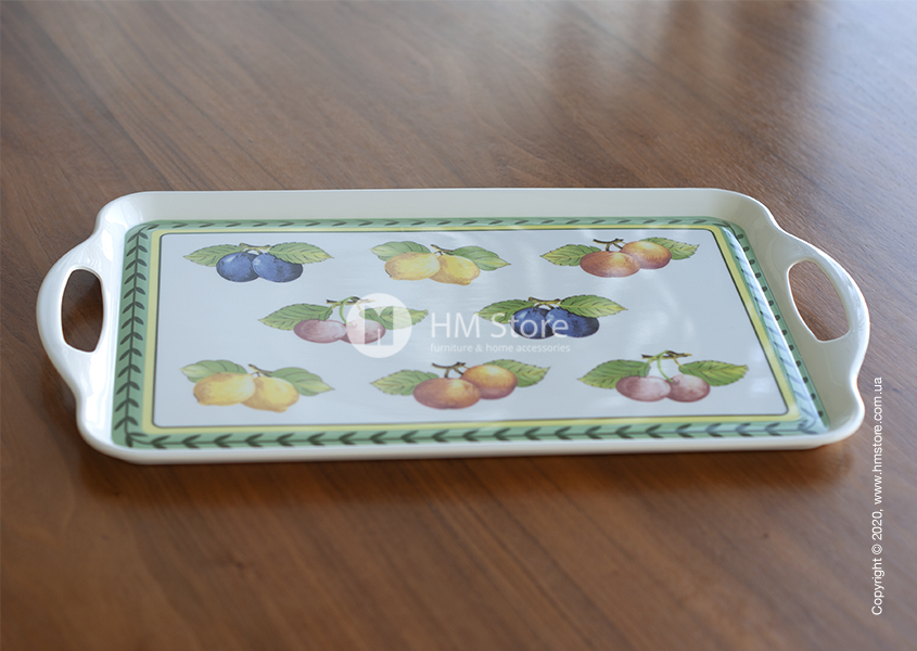 Серия изделий French Garden Kitchen характерна своим уникальным рисунком. Поднос имеет оригинальный яркий дизайн, сам аксессуар окрашен в белый цвет, а его лицевая часть декорирована красочным принтом. По периметру девайс украшен зеленым орнаментом, а в середине изображены спелые сочные фрукты.