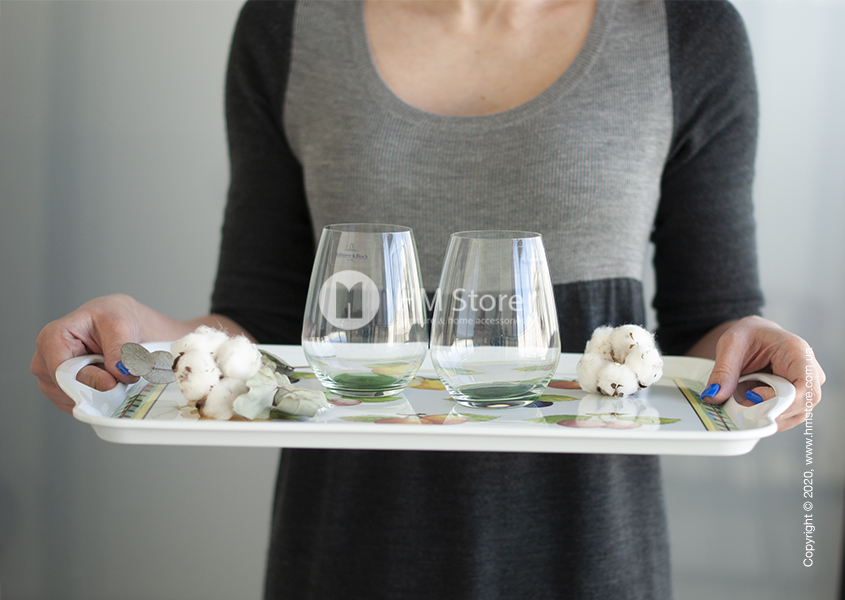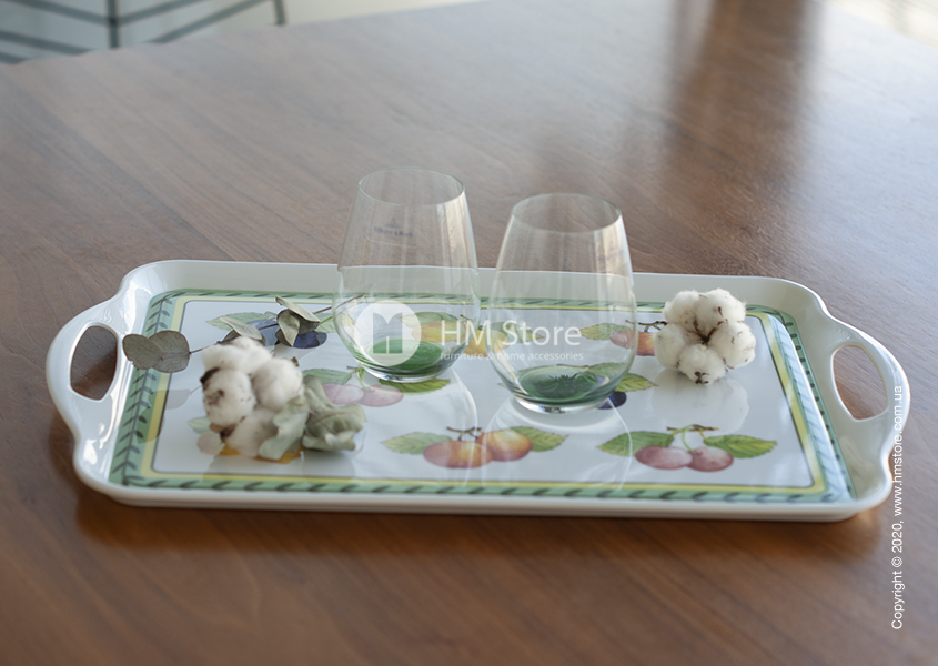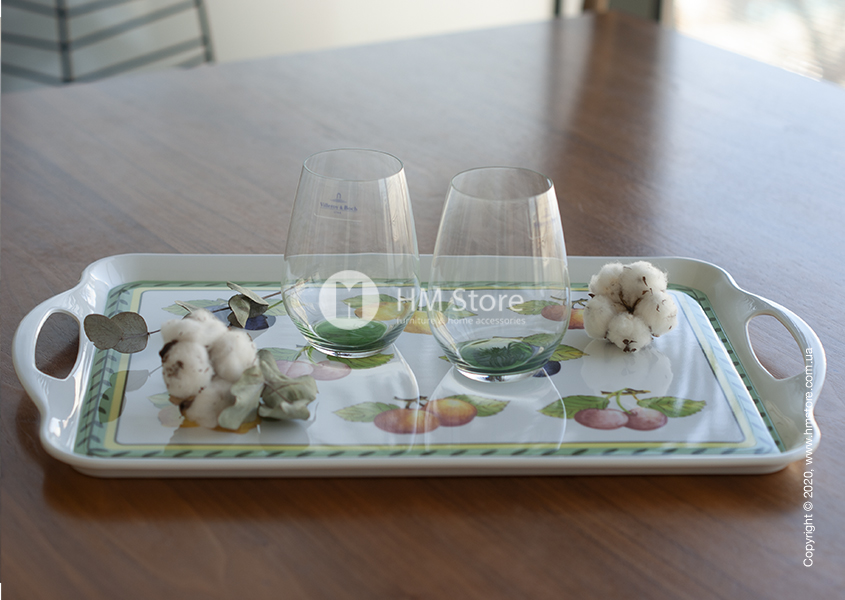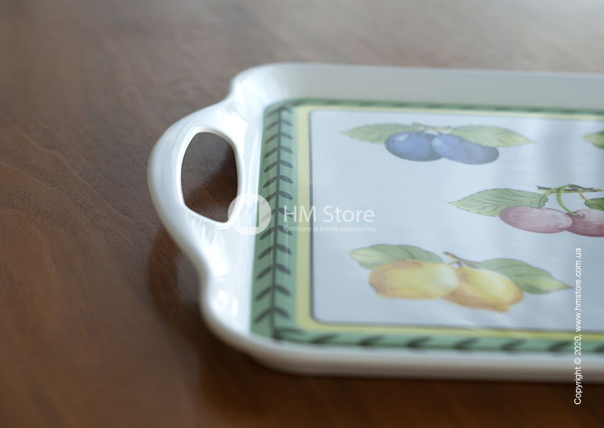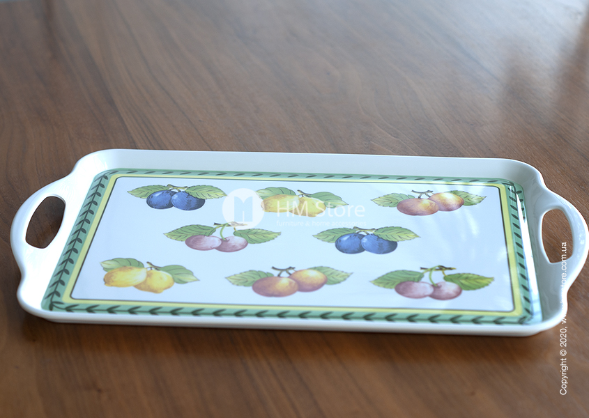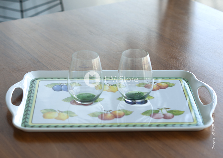 Серия изделий French Garden Kitchen характерна своим уникальным рисунком. Поднос имеет оригинальный яркий дизайн, сам аксессуар окрашен в белый цвет, а его лицевая часть декорирована красочным принтом. По периметру девайс украшен зеленым орнаментом, а в середине изображены спелые сочные фрукты.