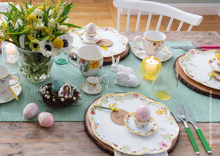 В день Пасхального Воскресенья на столе присутствует обязательный атрибут – пасхальный кулич. Для его подачи Вы можете использовать прекрасные блюда для подачи Colourful Spring или Spring Fantasy прямоугольной или круглой формы. Это главный атрибут пасхальной сервировки, поэтому его можно разместить в центре стола. Рядом поставьте всеми любимые крашенки в специальной фарфоровой подставке для яиц из серии Spring Awakening. Это форма будет не только очень удобной, но и станет восхитительным украшением стола. Для каждого гостя имеются изящные столовые и десертные тарелки для любимых праздничных гарниров, закусок и десертов, дизайн которых идеально подчеркивают пасхальную атмосферу. Во время чаепития обязательно пригодятся тематические чашки, которые подойдут для чая, кофе или узвара и превосходная сахарница с красивой утонченной крышкой. И конечно же, хочется разнообразить стол яствами и декоративными предметами.